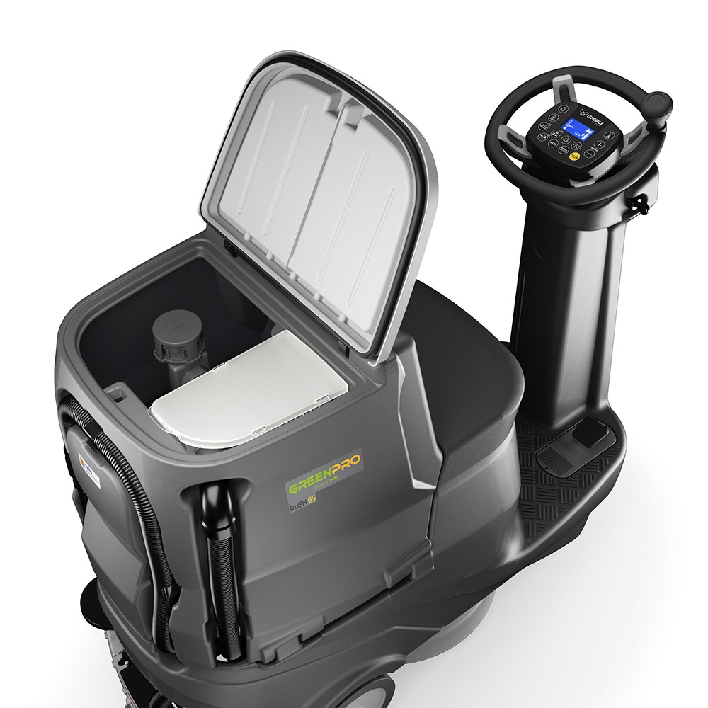 GREEN PRO RUSH 65 RD 55 BC är den nya åkbara skurmaskinen designad av Ghibli, som även finns i en miljövänlig version. Denna extremt kompakta och manövrerbara golvskurmaskin, tillverkad av återvunnen plast, kan arbeta med lätthet även i närvaro av hinder och i trånga miljöer. GREEN PRO RUSH 65:s många funktioner hanteras enkelt och intuitivt av operatören tack vare den praktiska kontrollpanelen med display integrerad direkt i maskinens ratt. Med samma robusthet och tillförlitlighet som standardmodellen garanterar GREEN PRO RUSH 65 utmärkta rengörings- och torkresultat.