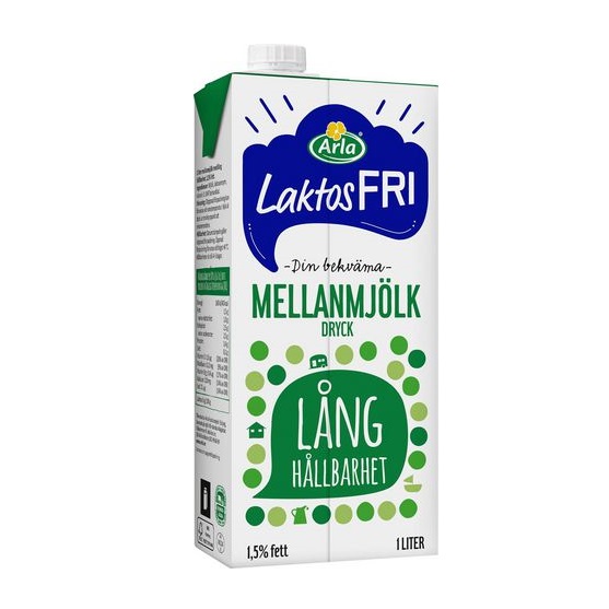 Framtagen speciellt för både vuxna och barn med laktosintolerans, denna laktosfria dryck ger en krämig och frisk smak. Ultrapastöriserad för längre hållbarhet och möjligheten att förvaras oöppnad i rumstemperatur. En naturlig källa till protein, kalcium och vitamin B12 ger styrka till din dag. Bygg muskler med protein och bibehåll en stark benstomme med kalcium – Arla Laktosfri Ultralång Hållbarhet Mellanmjölkdryck, för en fri och frisk känsla varje dag!