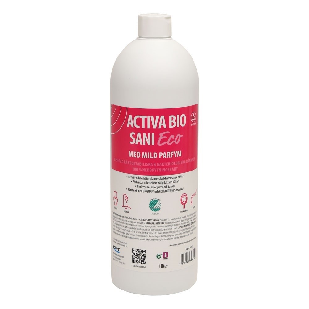 Den perfekta produkten för hela badrummet. Den högkoncentrerade gelprodukten fäster bra även på vertikala ytor såsom väggar och toaletter. Produkten är förstärkt med tensider från BIOSURF®-process som är 500 gånger effektivare än traditionella tensider. Produkten har en kalkhämmande effekt. Activa BIO Sani Free är en 6-i-1 produkt som ger en effektiv och komplett rengöring.