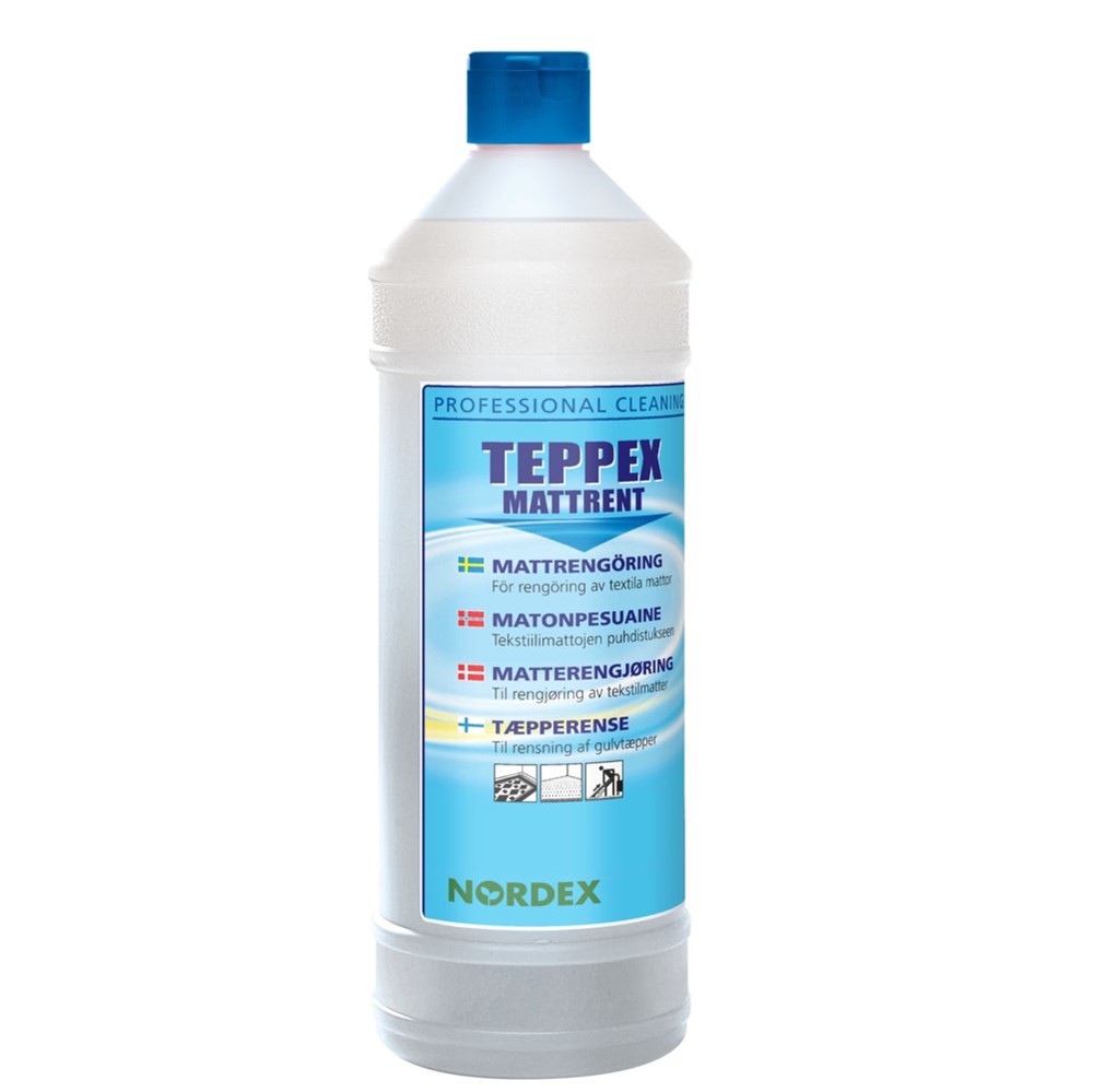 Rengöring utförs med mattvättmaskin och extraktionsmetod. Blöt upp eventuella fläckar med rengöringslösning av Teppex Mattrent och mjuk borste/duk. Spraya ut rengöringslösning jämnt över mattan, vänta 10 minuter. Lägg ut vatten med maskinen och bearbeta mattan (om maskinen har borstvals) och sug upp vattnet. Om mattan är mycket smutsig, lägg ut vatten och bearbeta utan att slå på sugmunstycket. Kör över några gånger och sug därefter upp vattnet.