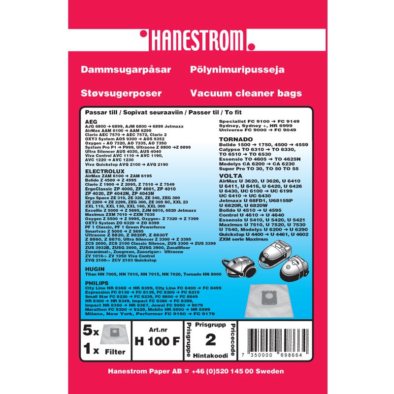 Dammpåse Volta,AEG,Hugin,Phili 5-pack + 1 filter